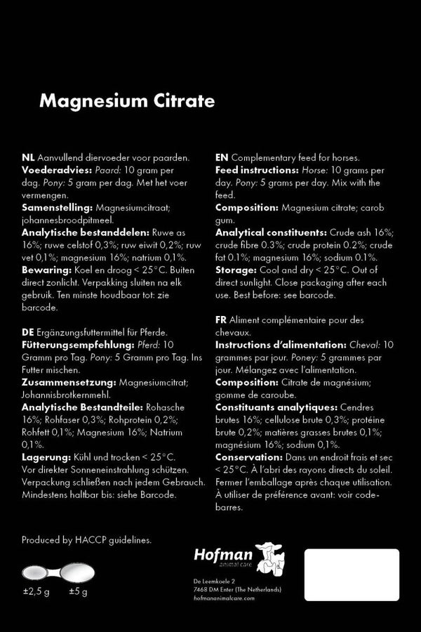 Le magnésium est une substance essentielle pour l'absorption du calcium dans les os et empêche également l'obstruction du calcium dans d'autres tissus. Le magnésium est particulièrement indiqué pour les chevaux d'exposition souffrant de stress.