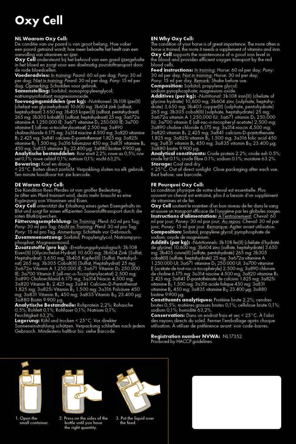 Equi Oxy Cell contient un taux élevé de fer, de vitamines et de minéraux (magnésium). Le fer est important pour un transport efficace de l'oxygène vers les muscles. Ce transport favorise le maintien de la puissance, de la résistance, de l'énergie et de la performance.