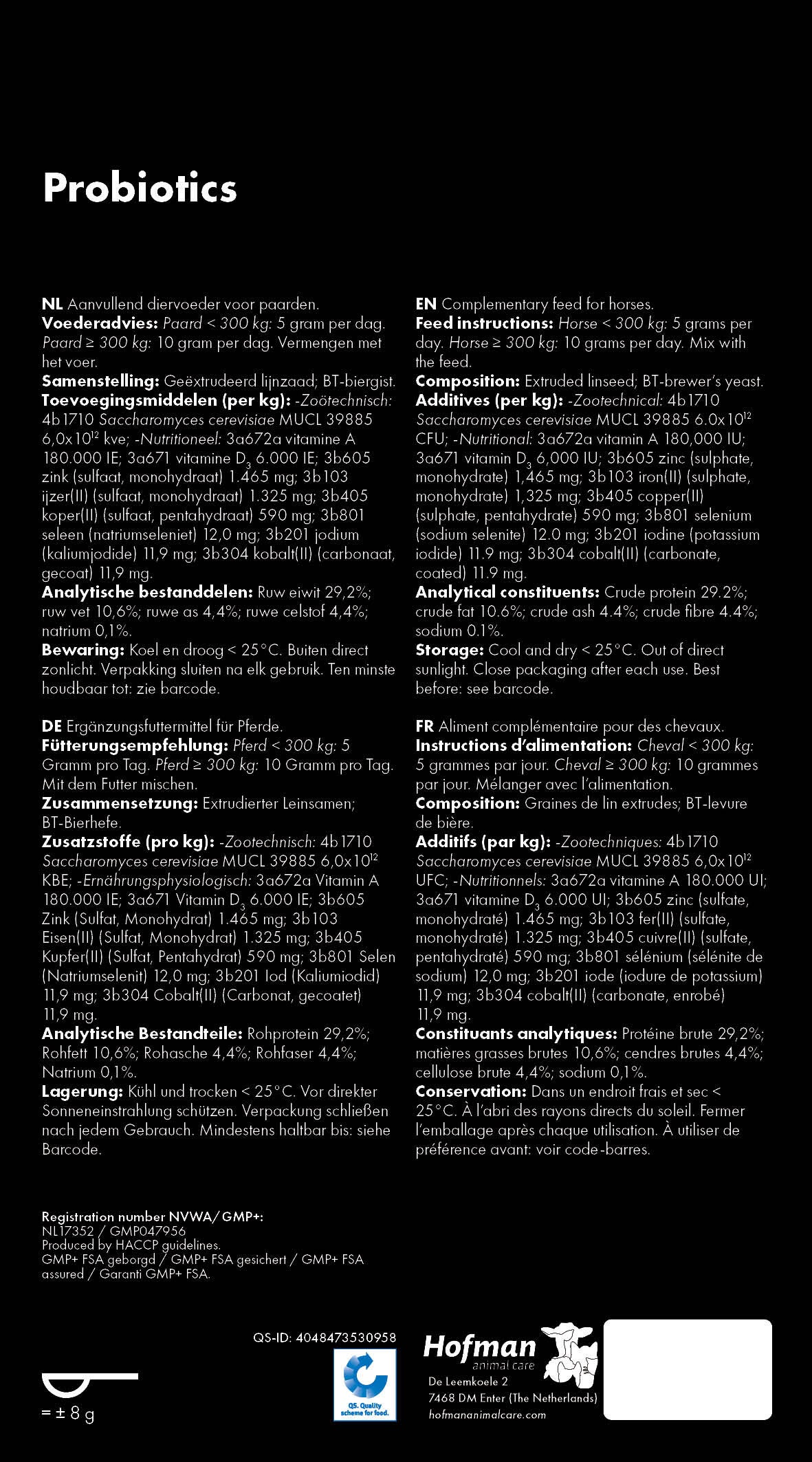 Probiotics contient de la levure de bière BT vivante(Saccharomyces cerevisiae) en tant que probiotique et des graines de lin extrudées en tant que prébiotique. Cette combinaison favorise la fonction intestinale, contribue à l'équilibre de la flore intestinale et stimule la digestion.