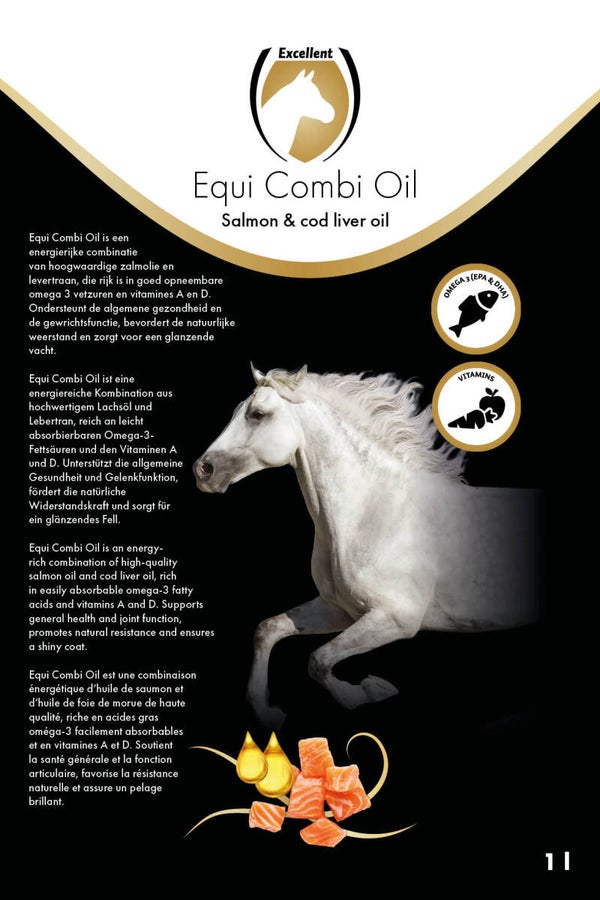 Excellent Chevaux Combi Oil est un aliment pour chevaux sous forme liquide. Il soutient la santé générale et la fonction articulaire, favorise la résistance naturelle et assure un pelage brillant.