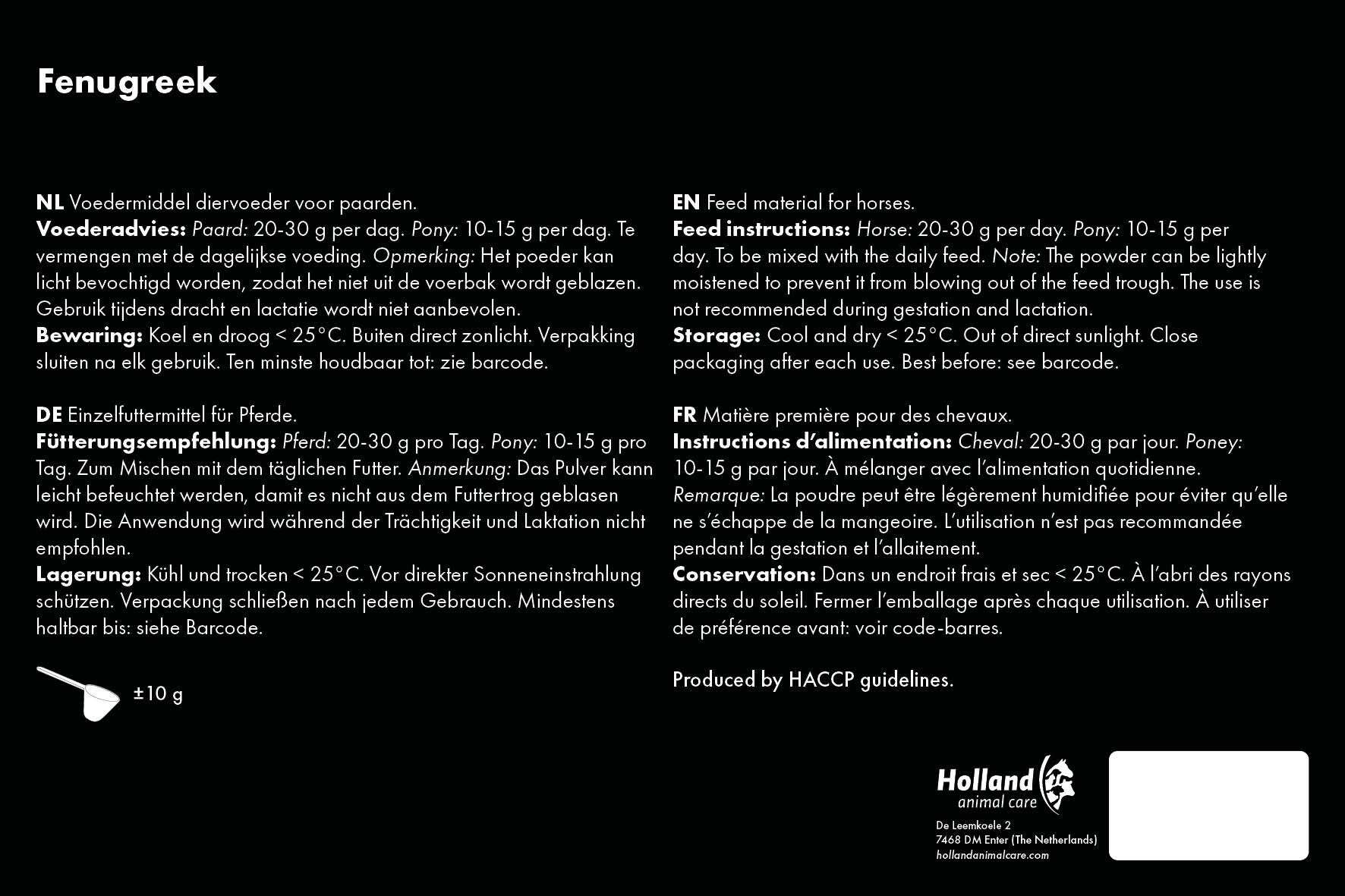 Chevaux / Poney : 20 - 30 g par jour mélangés à la nourriture.
