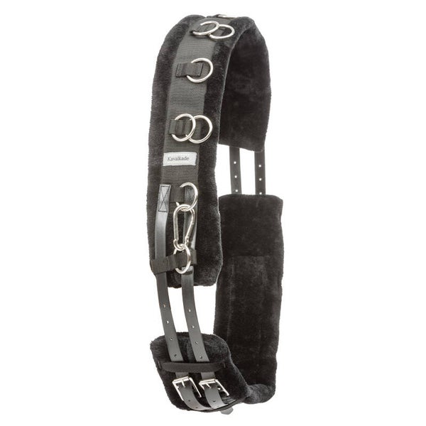 Cette sangle de longe, en polypropylène doublée de fausse fourrure douce, possède 12 anneaux. Les deux anneaux inférieurs sont réglables en hauteur grâce à une glissière. Ils peuvent également être fixés par un mousqueton. Des sangles robustes en similicuir assurent sa durabilité. La sangle est munie d'un anneau en D au centre.