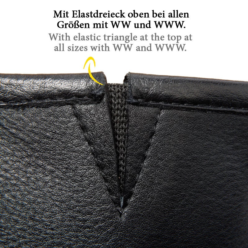 Confectionné en cuir de vachette tanné naturellement, exceptionnellement résistant et souple. Comprend une partie élastiquée sur le mollet extérieur, le long de la fermeture éclair robuste couleur laiton (de bas en haut).