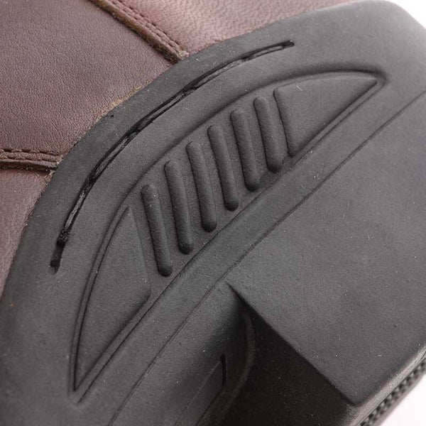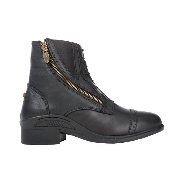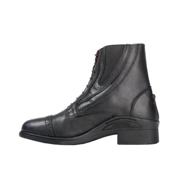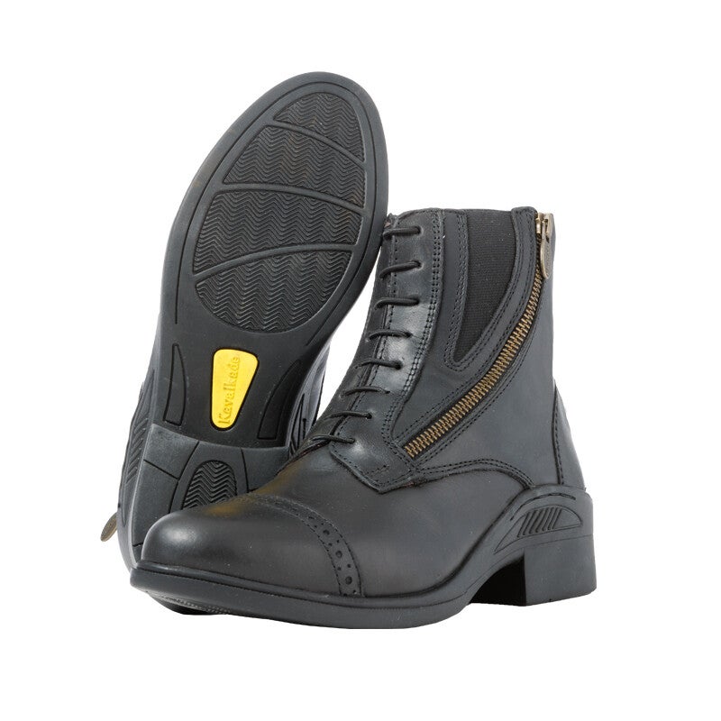 Fabriquée en cuir de vachette huilé, tanné naturellement et d'une robustesse exceptionnelle, cette chaussure est très résistante et facile d'entretien. Sa forme spécialement conçue offre un confort optimal. Elle est dotée d'un laçage frontal, d'une fermeture éclair latérale incurvée à l'élégant aspect laiton et d'une tirette siglée Kavalkade. Grâce aux empiècements élastiques latéraux, la chaussure épouse parfaitement la cheville. Elle est équipée de supports pour éperons. La semelle intérieure de haute qualité assure une répartition optimale de la pression et une bonne respirabilité pour un confort maximal. La semelle extérieure en caoutchouc robuste et antidérapante est très flexible, permettant un déroulé du pied naturel et préservant ainsi les articulations.