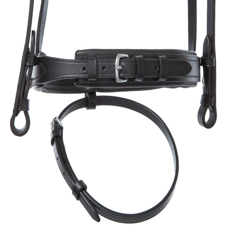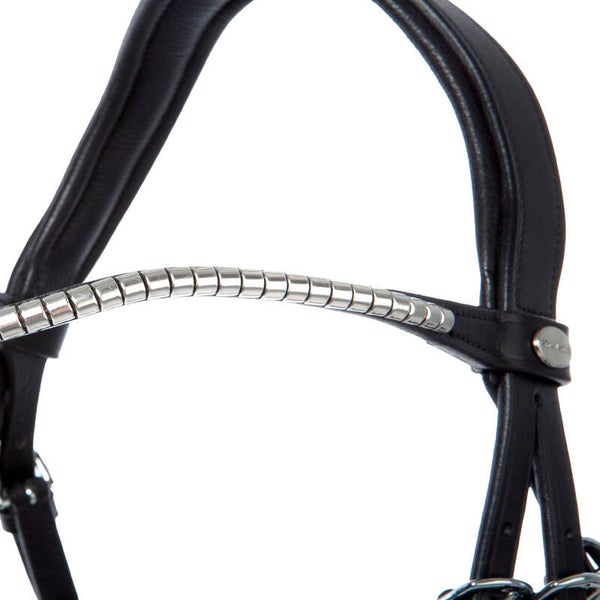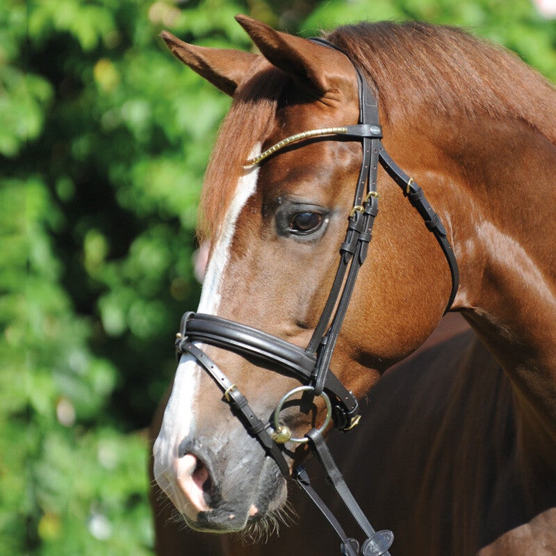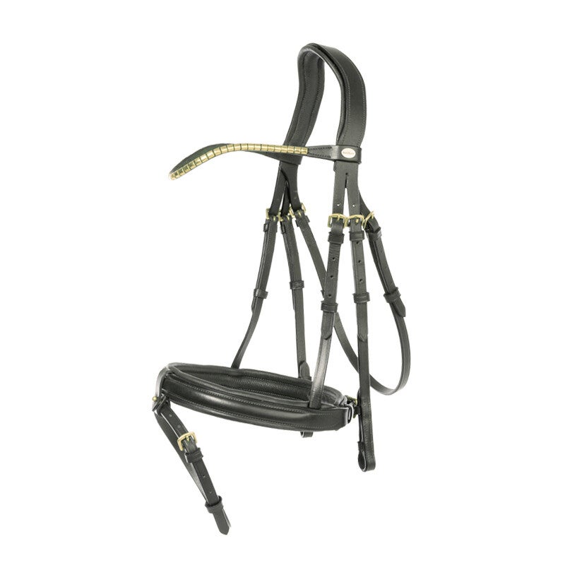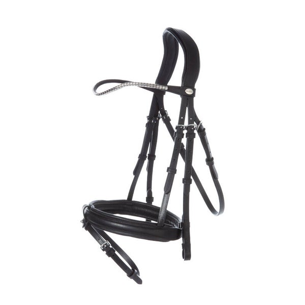 Le bridon « Clinchesse » est doté d'une muserolle combinée de style anglais et d'une têtière anatomique rembourrée. La têtière passe dans une boucle amovible en quelques étapes. Pour éviter les points de pression, la boucle est positionnée entre la muserolle et le rembourrage. Disponible en noir et marron foncé avec boucles argentées ou en marron avec boucles en laiton, tous les bridons possèdent un frontal étroit et incurvé avec pinces. Le bridon est réglable des deux côtés pour un ajustement optimal. Il est fourni avec des rênes en sangle munies de stoppeurs (16 mm pour les modèles V et W, 19 mm pour le modèle KB).