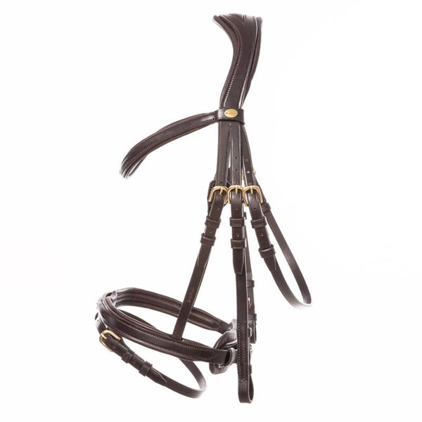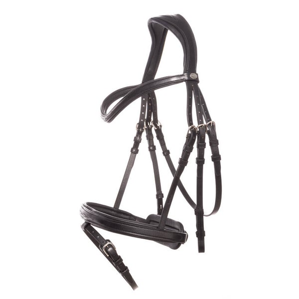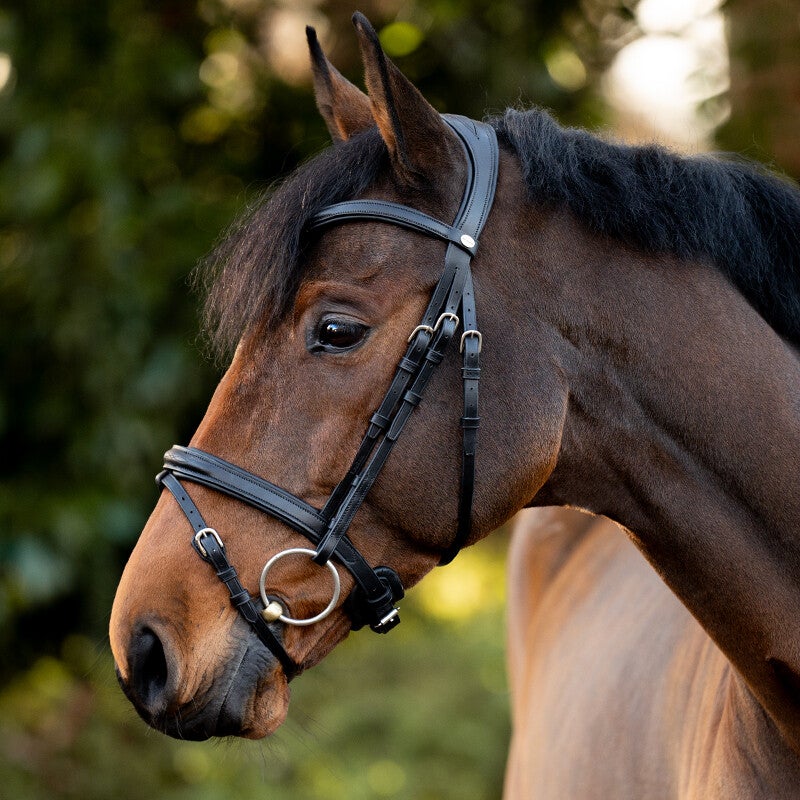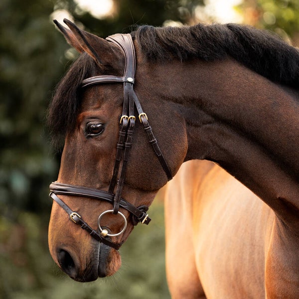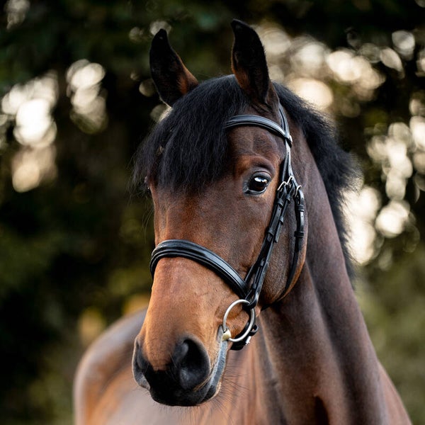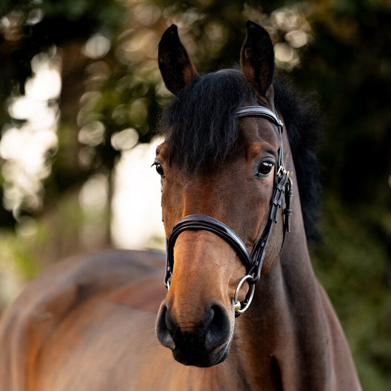 Le bridon « Robin » est confectionné en cuir allemand de haute qualité et possède une têtière particulièrement souple et de forme anatomique. Le rembourrage doux de la muserolle et du frontal offre un confort exceptionnel au cheval. La muserolle est réglable des deux côtés. Le bridon est vendu sans rênes.