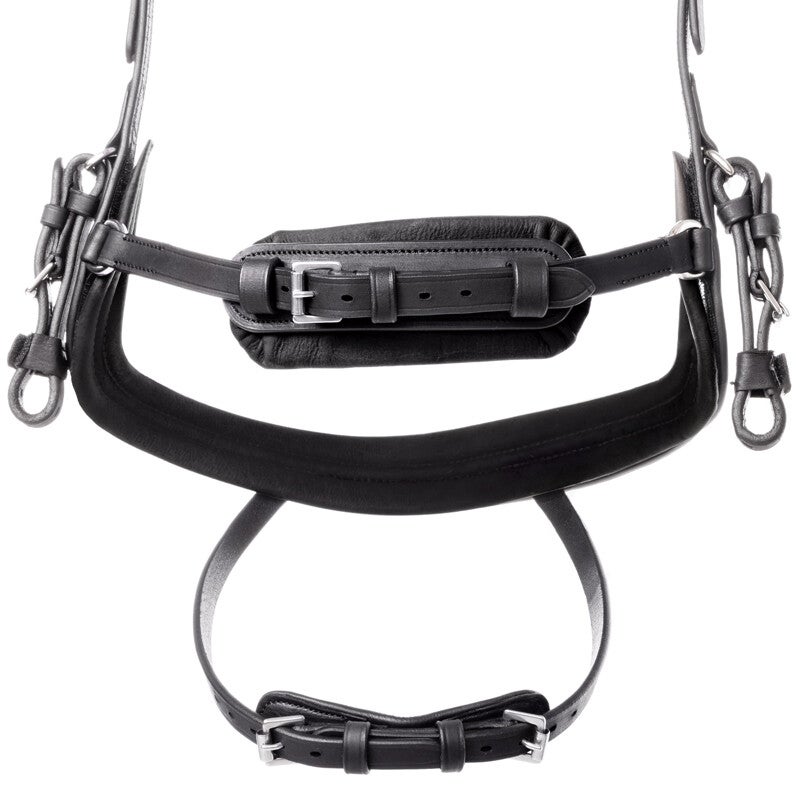 Ce bridon est doté d’une muserolle combinée de style anglais et est confectionné en cuir huilé de haute qualité, ce qui lui confère une grande souplesse. La muserolle est incurvée latéralement, offrant un confort exceptionnel au cheval. La sous-gorge est intégrée sur le côté de la muserolle, soulageant la pression sur l'arête du nez et facilitant la respiration du cheval. Les montants intégrés à la muserolle confèrent une allure élégante en réduisant le nombre de sangles sur les côtés de la tête. Grâce au système KavalSH4, le bridon peut également être utilisé sans sous-gorge. Caractéristique unique : le point de fixation de la sous-gorge est invisible, contrairement aux bridons classiques à sous-gorge amovible. La têtière présente une découpe au niveau de la nuque pour soulager la pression sur le ligament nuchal. Sa forme anatomique et son rembourrage assurent un ajustement confortable et un dégagement suffisant pour les oreilles. Pour un soulagement de la pression latérale, la sous-gorge est fixée à la têtière et inclinée, garantissant un maintien plus stable. Le bridon KavalSH4 « Caliano » est vendu sans rênes.