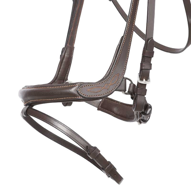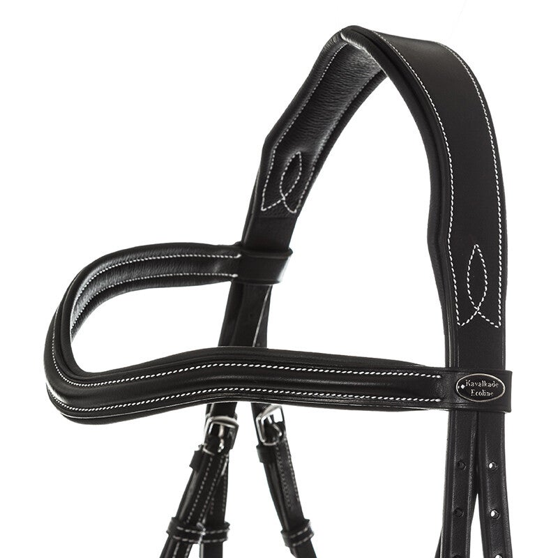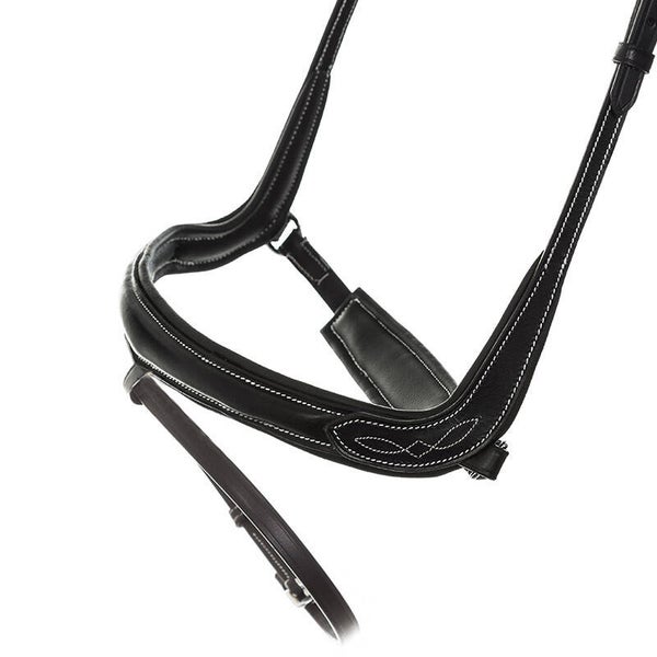 Le bridon Ivy est doté d'une muserolle combinée de style anglais. Les montants sont solidement cousus à la muserolle grâce à une conception incurvée. Cette conception soulage délicatement la pression sur les nerfs autour de la bouche, et la coupe incurvée spéciale, associée à des surpiqûres contrastées et à des broderies décoratives, confère au bridon une allure élégante à cheval. La têtière du bridon Ivy est nettement plus large que les têtières classiques. De plus, sa forme anatomique permet de ne pas entraver les mouvements des oreilles du cheval. La muserolle et la têtière sont toutes deux rembourrées et épousent confortablement les contours de la tête du cheval.