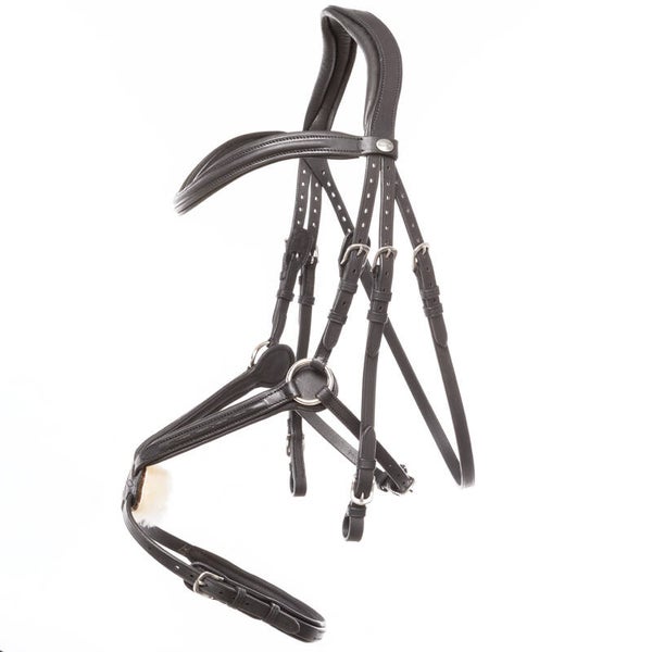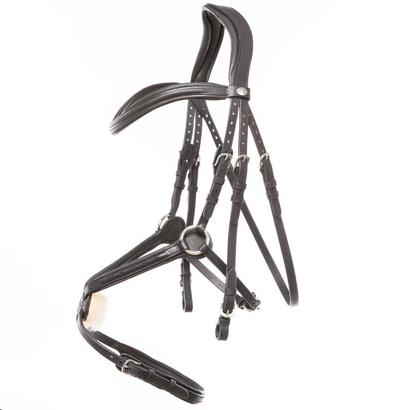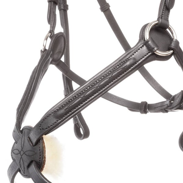 - comprend plaquettes de muserolle amovibles avec velcro (cuir noir ou marron), (fourrure synthétique) et (fourrure d'agneau)
