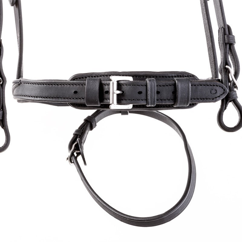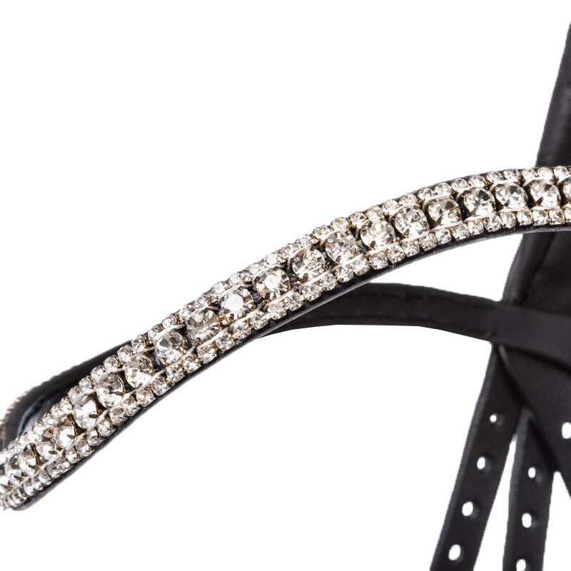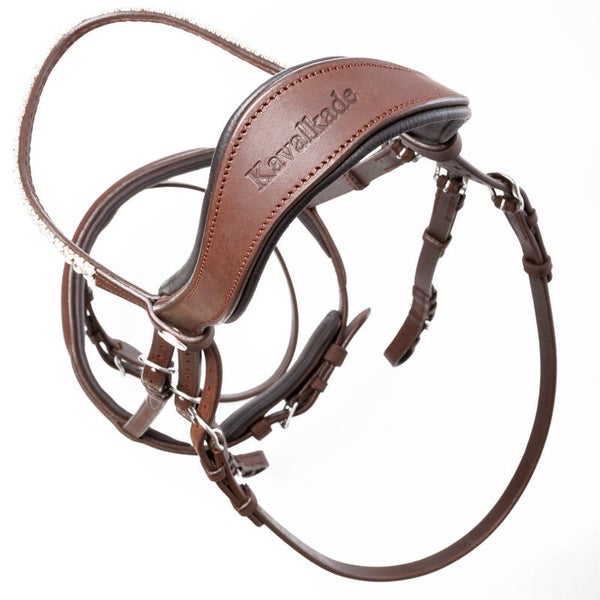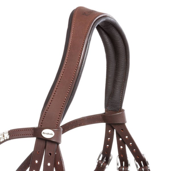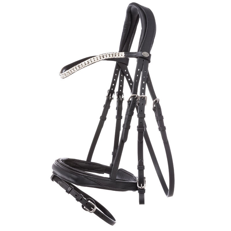 Cette bride est confectionnée en cuir huilé de première qualité et présente une têtière anatomique très souple et rembourrée, dotée d'une découpe profonde pour les oreilles qui soulage la pression sur les nerfs et offre une grande liberté de mouvement aux oreilles. Le rembourrage doux de la muserolle et du frontal assure également un confort exceptionnel au cheval. Pour une allure distinctive, la muserolle est ornée d'élégants éléments décoratifs en cuir sur les côtés. Le frontal est scintillant de strass blancs de différentes tailles. La muserolle est réglable des deux côtés. Rênes étroites en caoutchouc avec arrêtoirs (16 mm) incluses.