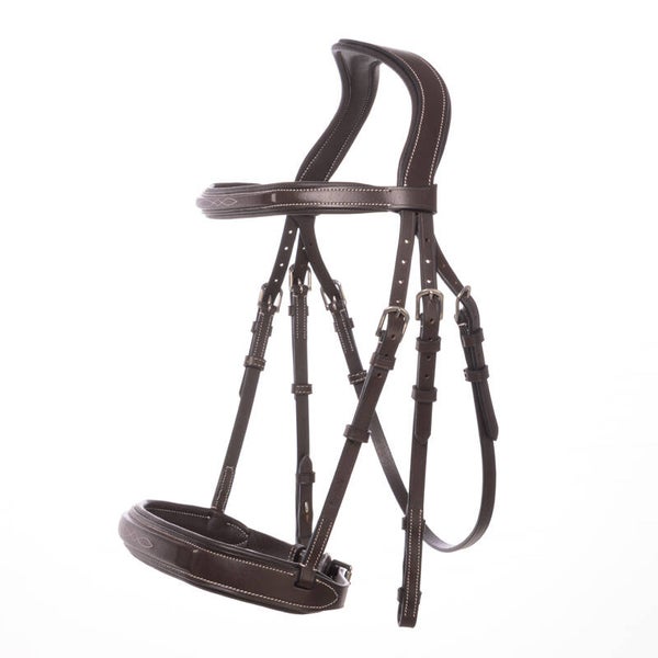 La têtière est de forme anatomique pour soulager la pression sur les nerfs et offrir une grande liberté de mouvement aux oreilles. La têtière et la muserolle sont rembourrées. Les surpiqûres décoratives sur la muserolle et le frontal ajoutent une touche de couleur subtile et un style sobre et élégant. L'un des atouts majeurs de ce bridon réside dans ses rênes de chasse en cuir souple, tressées avec deux lanières. Celles-ci assurent une prise en main ferme et confortable.