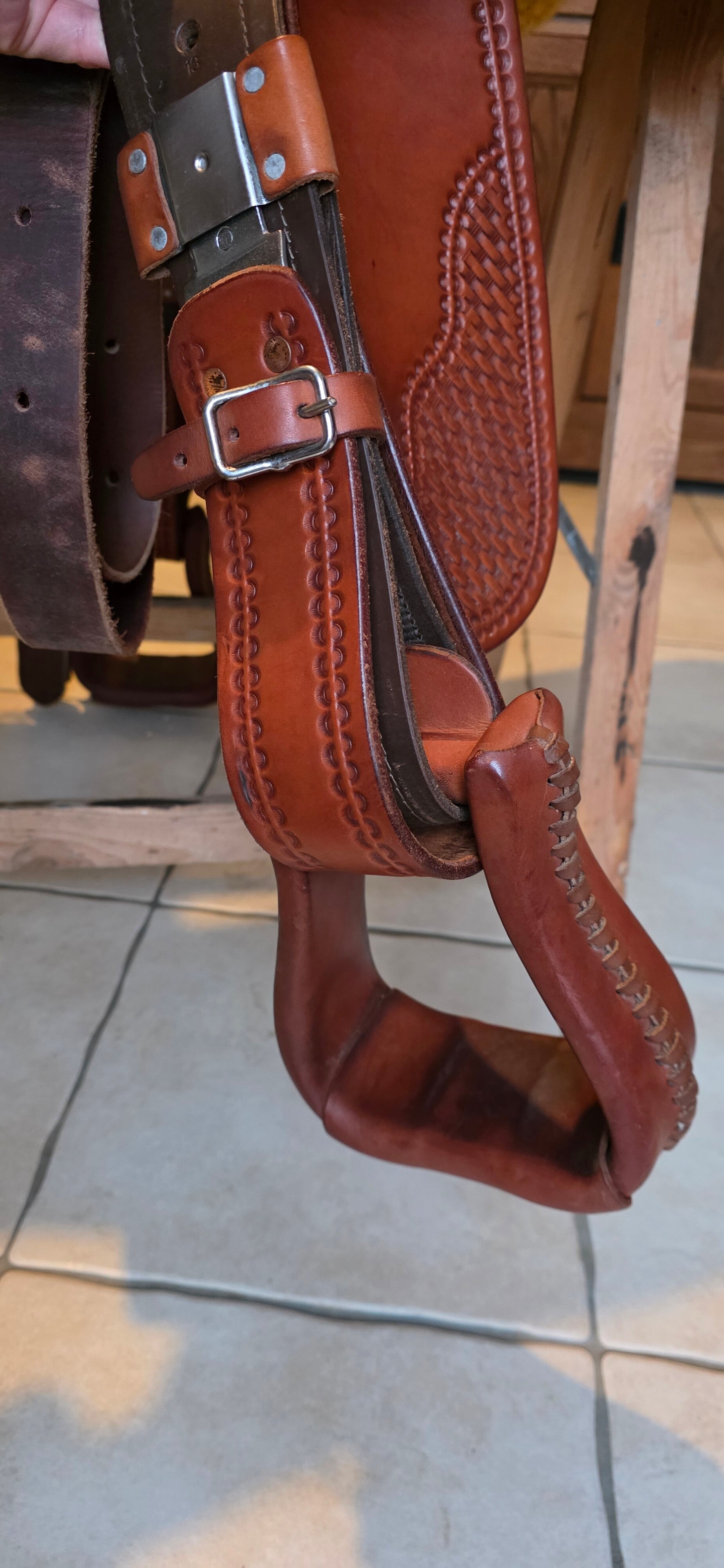 - Étriers en bois, renforcés par du métal et enveloppés de cuir pour une durabilité accrue.