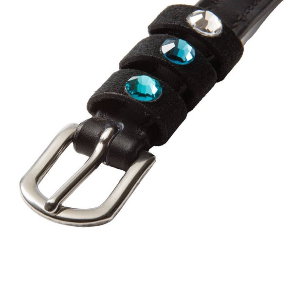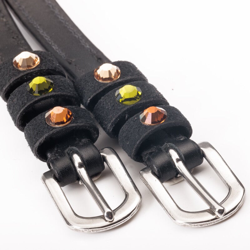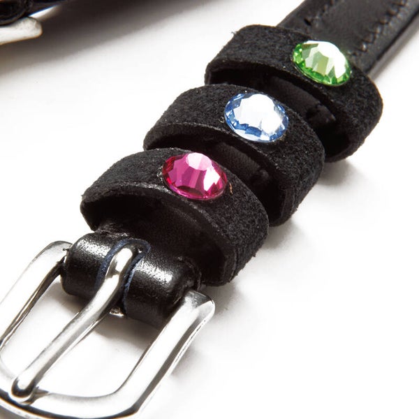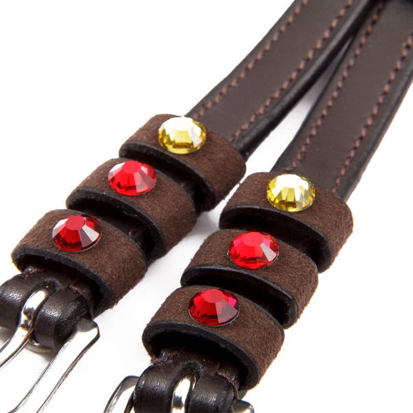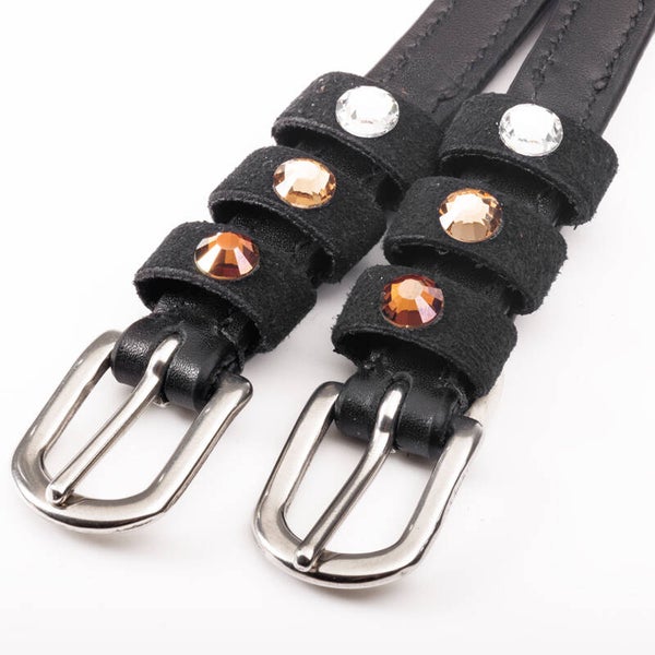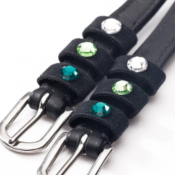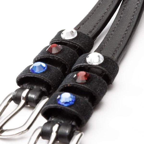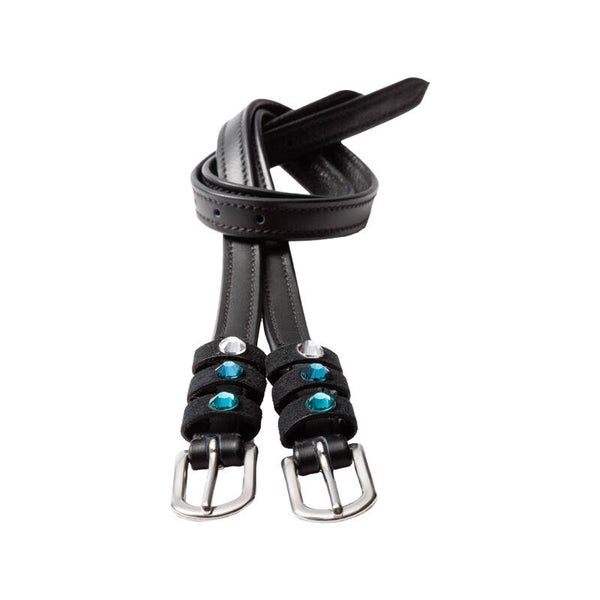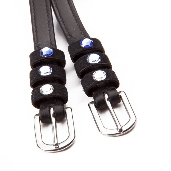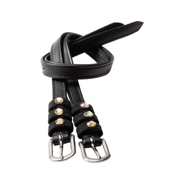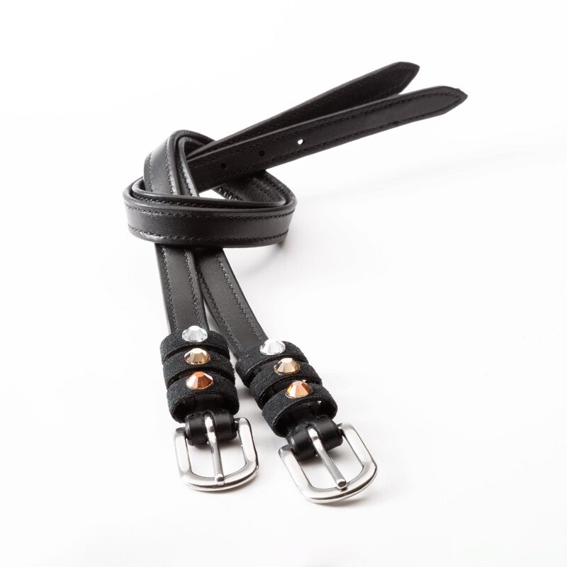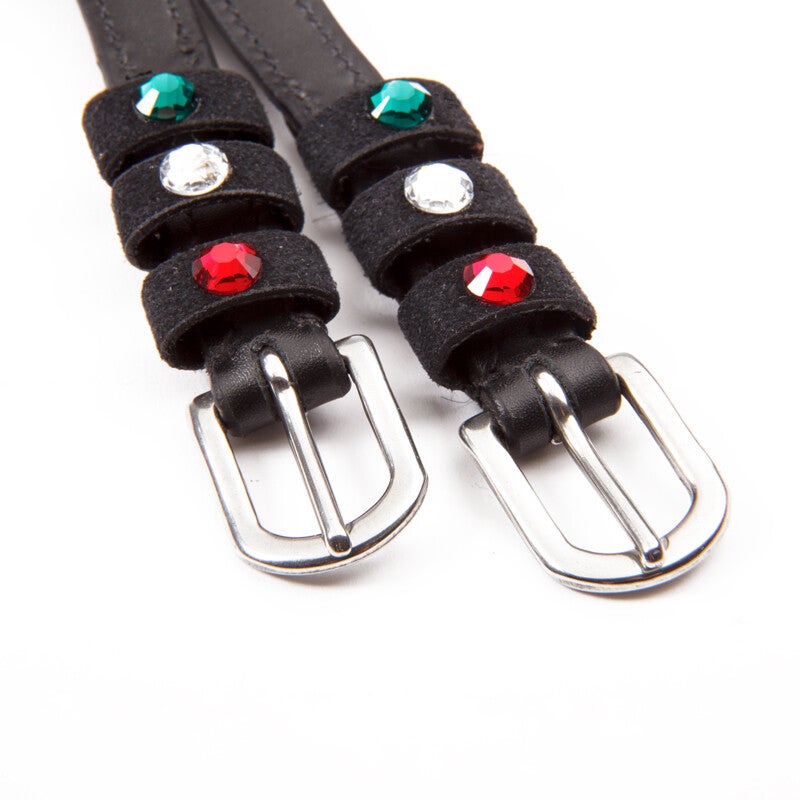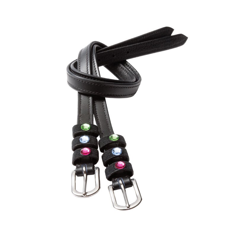 Sangles d'éperons « Seasons Dreams » en cuir souple, résistant et de haute qualité, ornées de strass colorés sur les passants. Vendues par paire.