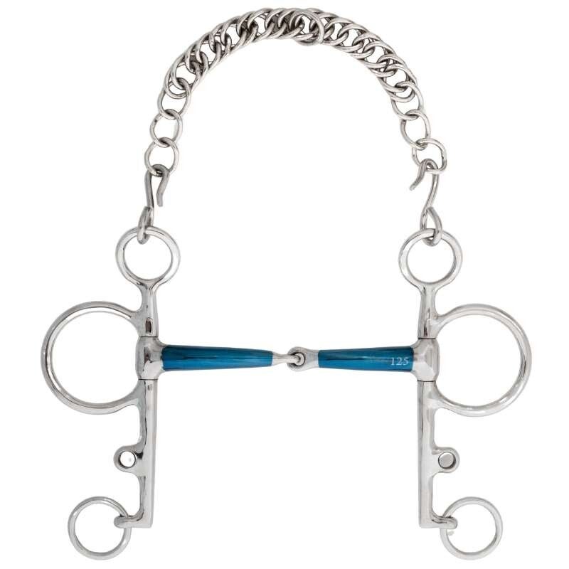 Le mors Pelham possède des branches longues et est fourni avec une gourmette. Il est principalement utilisé en saut d’obstacles et en concours complet.