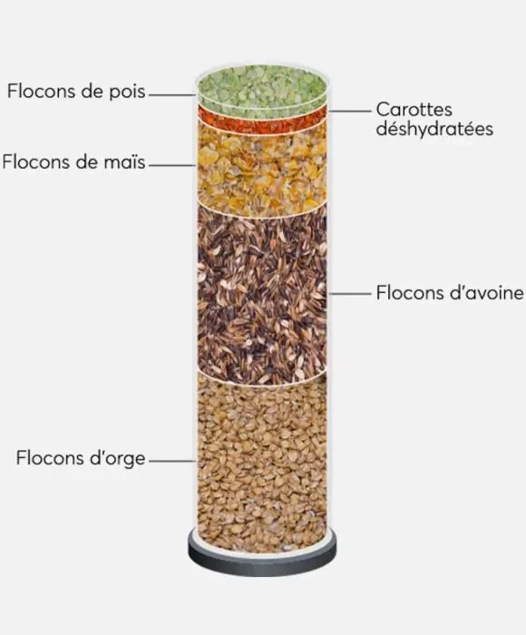 Flocons d'orge, Flocons d'avoine, Flocons de maïs sans OGM* (< 0,9%), Carottes déshydratées, Flocons de pois.