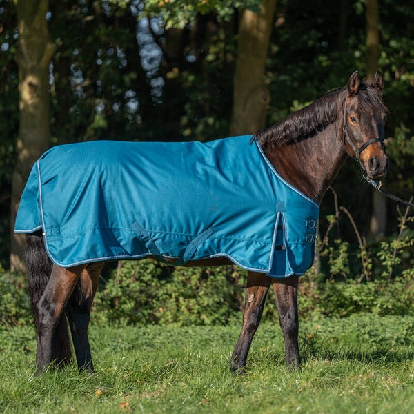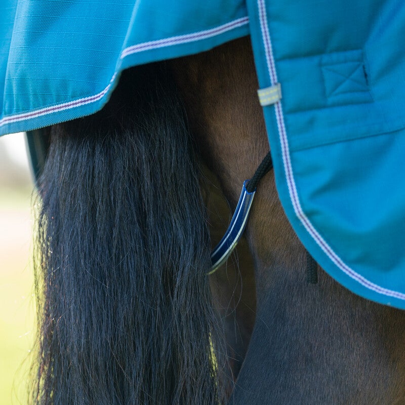 Fabriquée sans couture au dos et avec une découpe au garrot avancée, sa longueur réelle est environ 10 cm supérieure à la longueur du dos du cheval. Ce positionnement est intentionnel : la couverture se place ainsi devant le garrot, protégeant de manière optimale les épaules et évitant qu'elle ne glisse derrière le garrot lorsque le cheval lève et baisse la tête.