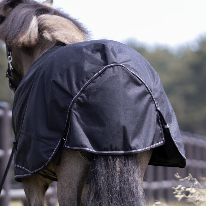 Cette couverture de 50 g est coupe-vent et imperméable (4000 mm de colonne d'eau, respirabilité de 3000 g/m² par 24 h) et résistante aux déchirures et à l'abrasion grâce à son polyester ripstop 1200 deniers. Pour un ajustement optimal, la fermeture au niveau du poitrail est équipée d'un velcro et de deux anneaux en D pour un réglage personnalisé. Les sursangles croisées et le rabat de queue empêchent la couverture de glisser sur le cheval islandais et assurent un maintien sûr.