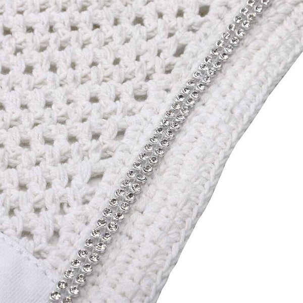 Bonnet anti-mouches élégant orné de deux rangées de strass. Confectionné en coton (oreilles en polyester), crocheté et agrémenté d'un triangle brodé.