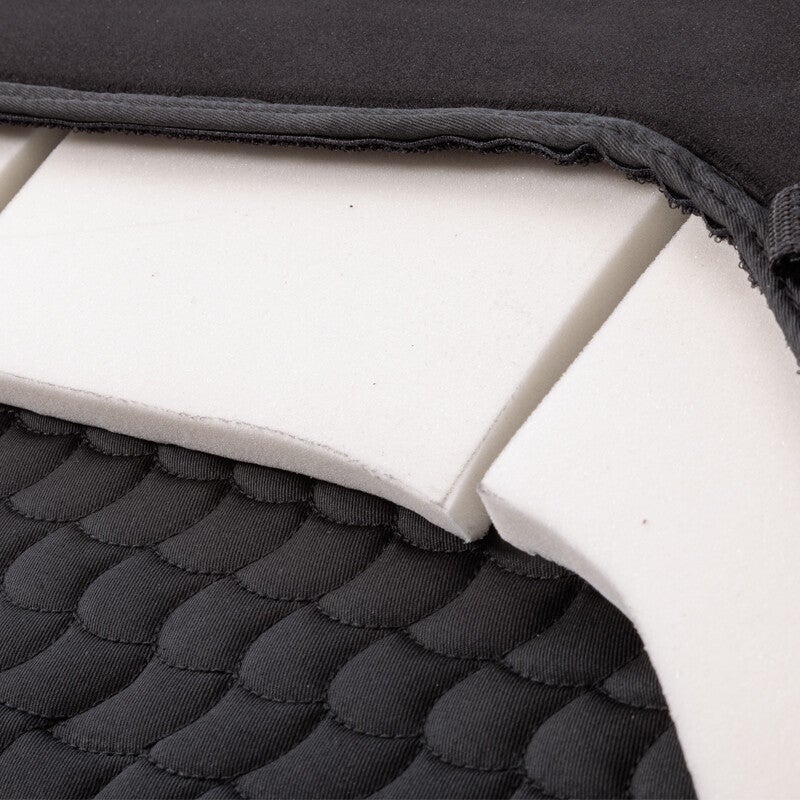 Le tapis de selle « KavalTop-Vario Shape » combine un tapis et une couverture de selle. Son adhérence optimale assure une excellente stabilité. Le rembourrage en mousse cousu, de forme anatomique, se positionne précisément sous les taquets de la selle, garantissant un maintien sûr et empêchant la selle de glisser pendant la monte. Sa forme anatomique offre une répartition de la pression plus confortable, sans bords tranchants ni points de pression inconfortables au niveau des genoux. De plus, ce tapis de selle permet d'ajuster la selle : grâce à ses fermetures Velcro, il est possible de remplacer ou d'ajuster les inserts en mousse à mémoire de forme. C'est la solution idéale pour un confort optimal.