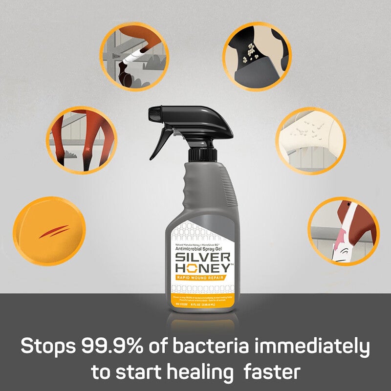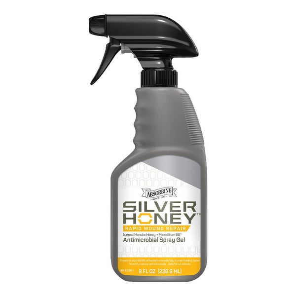 La pommade cicatrisante rapide Silver Honey® d'Absorbine est le premier produit à combiner le pouvoir naturel du miel de Manuka et du MicroSilver™ BG. Sa formule révolutionnaire hydrate la zone traitée pendant la cicatrisation et élimine instantanément 99,9 % des bactéries. Elle protège également le microbiome cutané, favorisant une cicatrisation rapide. Efficace contre les coupures, écorchures, plaies, éruptions cutanées, mycoses, égratignures, gale de boue, irritations et brûlures.